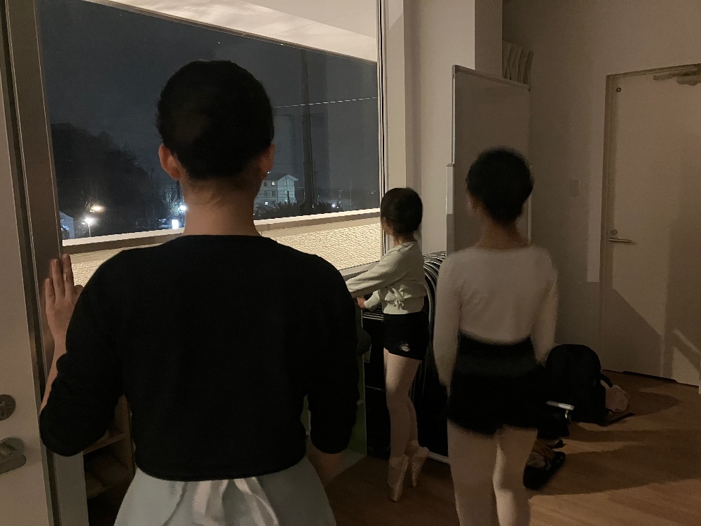 トゥシューズのまま背伸びしている子、